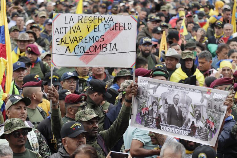 Con proclamas como “Fuera Petro”, los exmilitares y expolicías, algunos de ellos vistiendo el uniforme de camuflaje, recitaron la “Oración Patria” en esta manifestación que se llevó a cabo en vísperas del Día de la Independencia en el que, según han dicho, los reservistas y veteranos no participarán en el tradicional desfile militar por no estar de acuerdo con las políticas del Gobierno.