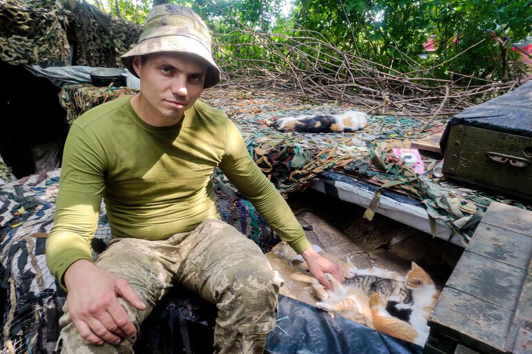 Sentado sobre una caja de munición, otro militar le completa mientras acaricia a los gatos: “Con los rusos nunca se puede estar seguro”.