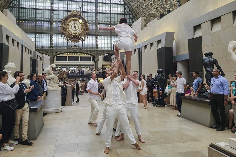 En la galería principal del museo, que muestra pinturas de Manet, Renoir, Van Gogh, Renoir o Munet, así como esculturas de Rodin, entre muchos otros, nueve acróbatas danzaron y saltaron por todo el espacio, en un espectáculo concebido por Rachid Ouramdane y llamado Les Traceurs, que invitó a los asistentes a correr junto a los artistas para seguir la obra.
