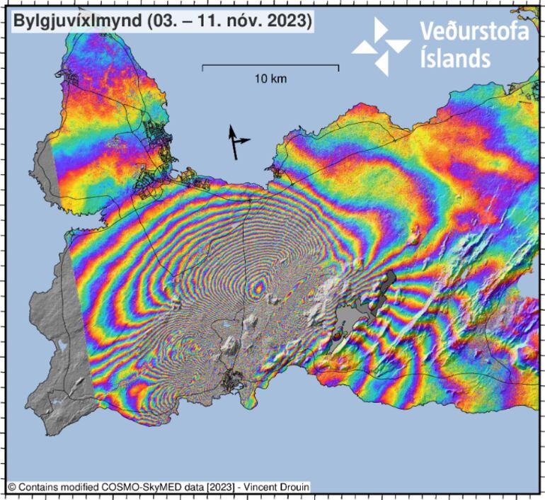 En los datos GPS del pueblo de Grindavík se observan tasas decrecientes de deformación del suelo. Esta característica fue identificada por primera vez por la IMO en imágenes de radar satelital a principios del 11 de noviembre.