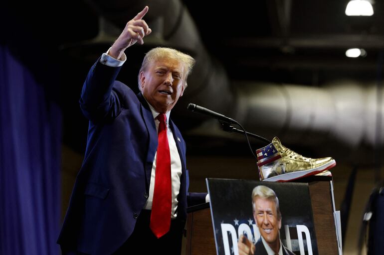El republicano Donald Trump apareció por sorpresa en un congreso de zapatillas en Filadelfia (Pensilvania), donde presentó el modelo ‘Never Surrender’ (Nunca te rindas), un calzado dorado con detalles de la bandera estadounidense, la letra T de su apellido y un precio de 399 dólares.