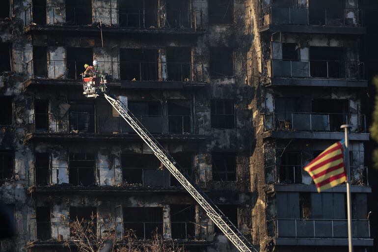 El inmueble, que se mantiene en pie junto a una rotonda del barrio de Campanar, amaneció completamente teñido de negro y sobrevolado por drones, a la espera de que los bomberos puedan acceder al interior, mientras se mantiene acordonada la zona y ya se ha desmontado el hospital de campaña.