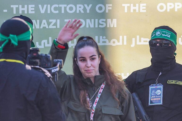 La joven de 20 años fue entregada por el grupo islamista Hamás a la Cruz Roja en una ceremonia con escenario y público preparada en una plaza devastada de la localidad de Yabalia, en el norte de la Franja de Gaza.