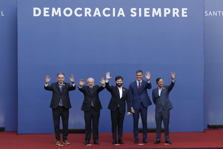 Boric, recibió este lunes en el palacio de La Moneda a los jefes de Estado o de Gobierno de España, Pedro Sánchez; Brasil, Luiz Inácio Lula da Silva; Colombia, Gustavo Petro; y Uruguay, Yamandú Orsi, para debatir sobre el avance ultra y los autoritarismos.