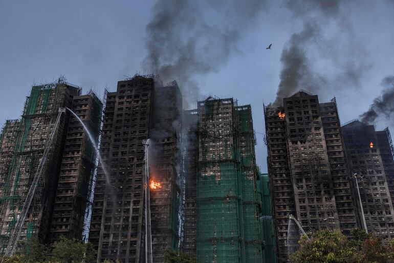 Las llamas comenzaron en los tradicionales andamios de bambú que rodeaban los edificios de 31 pisos del complejo Wang Fuk Court, en el distrito Tai Po de la zona norte, que estaba en reparación.
