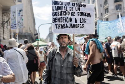 Jorge Sola, uno de los secretarios generales de la central obrera, describió la reforma laboral como “un ataque a la libertad que este Gobierno tanto defiende, al único patrimonio que tiene el ser humano, que es el trabajo”. De la protesta participaron diputados, senadores y referentes políticos de la oposición, incluido el gobernador de la provincia de Buenos Aires, el peronista Axel Kicillof, quien dijo a medios locales que “esta reforma laboral no tiene un solo elemento que beneficie a los trabajadores”.
