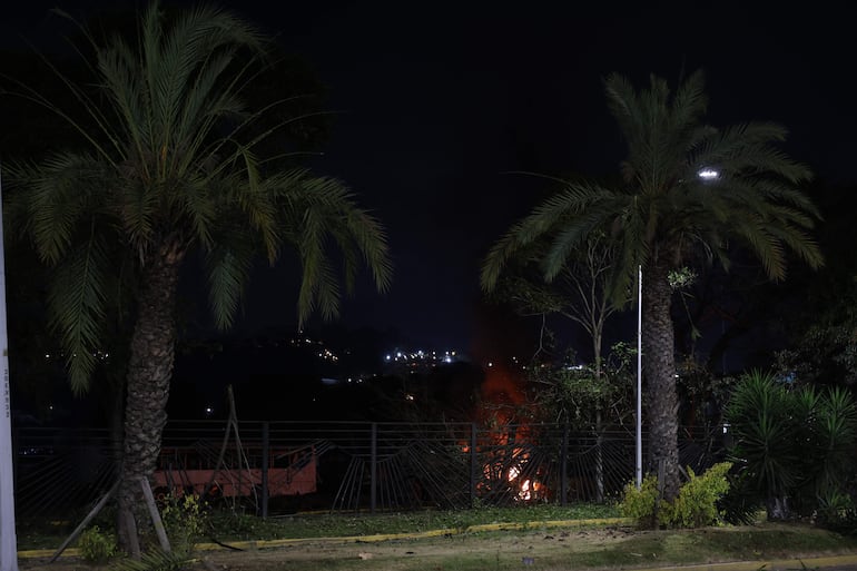 Además del fuego, en el lugar se observaban restos de árboles y destrozos en la principal autopista de la ciudad, adyacente a la instalación militar, donde también se encontraban uniformados en vehículos que rodeaban la zona.