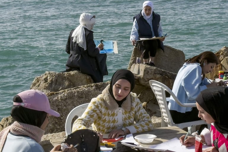 En mesas y sillas de plástico apostadas en el paseo marítimo de la capital de Gaza o en su espigón, unas 40 jóvenes dibujan bajo el sol: tiendas de campaña, sandías, a otras mujeres o, varias de ellas, la panorámica del cielo y el mar.