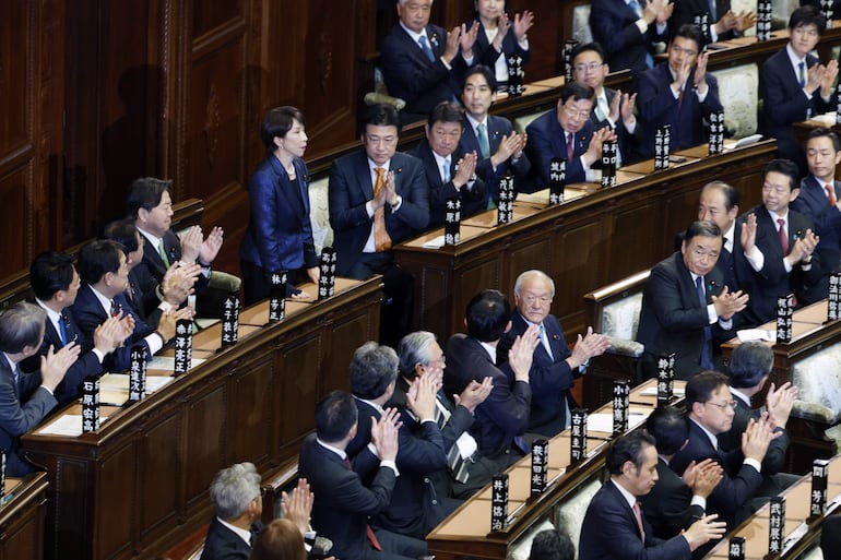 Sanae Takaichi (centro, a la izq.) es confirmada como primera ministra de Japón. Recibió la ovación de sus colegas parlamentarios.FRANCK ROBICHON
