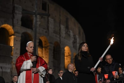 El rito, que rememora el calvario de Jesús desde su condena a muerte hasta su sepultura, comenzó en el interior del Anfiteatro Flavio, símbolo del martirio de los primeros cristianos.