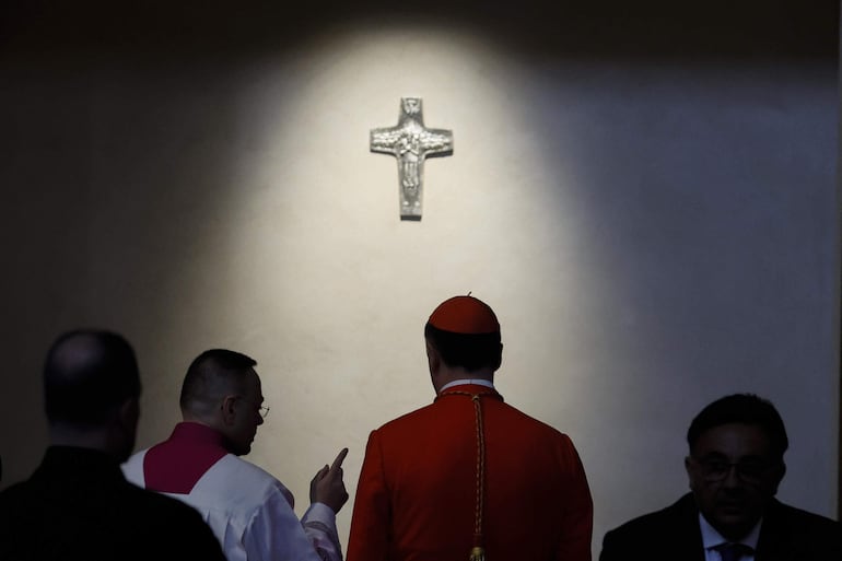 Tras la misa, los cardenales se congregaron ante la tumba decorada hoy con flores amarillas y blancas y una vela, para rezar todos juntos ante su sepultura.
