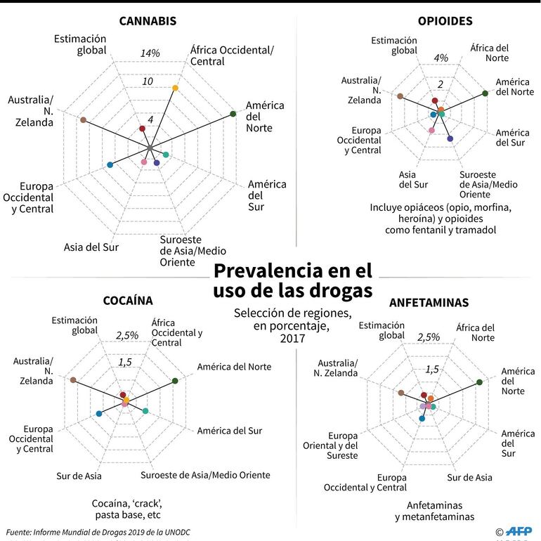 En el mundo hay un total de 18,1 millones de consumidores de cocaína, y América del Norte es el lugar donde mayor es la tasa de consumo, con el 2,1 % de la población de entre 15 y 64 año.