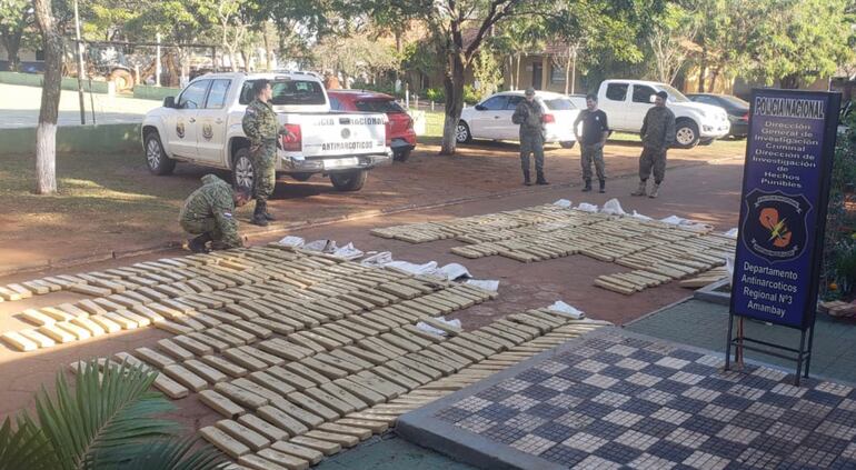 Tras una verificación, los antidrogas hallaron 580 kilos de marihuana ya prensada y 1.500 kilos de la droga picada. Por todos los indicios hallados se puede afirmar que los marihuaneros se encontraban en plena faena de prensar la droga hasta minutos antes de la llegada de los intervinientes y que huyeron del lugar, gracias a los ¨campanas¨, que los marihuaneros poseen en las cercanías del campamento y que avisan cuando los intervinientes se están acercando.