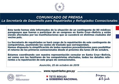 La Secretaría de Desarrollo para Repatriados y Refugiados Connacionales informó que ya se encuentran en contacto, a través de la representación consultar de nuestro país en Santa Cruz, Bolivia, tanto con los 80 médicos que fueron a participar de un Congreso, como con sus familiares.