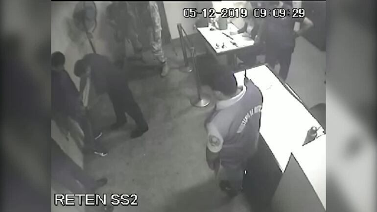 El video de las cámaras de seguridad instaladas en el retén del Palacio de Justicia registraron como Rotela al llegar a las 9:07, escoltado por dos guardias penitenciarios, además de agentes de apoyo de la Policía Nacional, ya que tenía que enfrentar juicio oral y público a las 10:00.