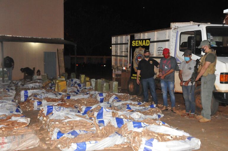 El procedimiento se realizó en la tarde de hoy, a unos 5 kilómetros antes de llegar a Salto del Guairá, sobre la ruta PY03. La carga ilícita venía en un camión, marca Mercedes Benz, modelo 709-D, guiado por Alejandro Andrés Guasch, de 25 años, acompañado por Gabriel Rivas Cano, de 28 años, quienes fueron detenidos.