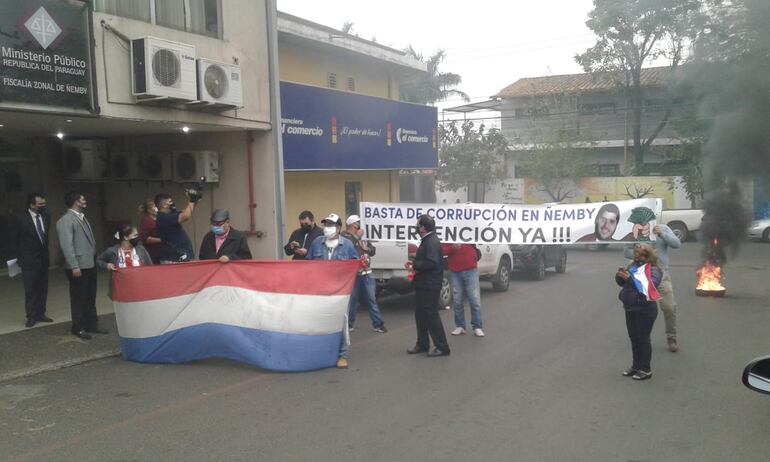 Los manifestantes se dieron cita frente a la sede del Ministerio Público munidos de pasacalles, quemaron cubiertas y aserrín hasta que intervino la Policía Nacional, pues estaban cerrando el libre tránsito, informó el corresponsal Higinio Ruiz Díaz.