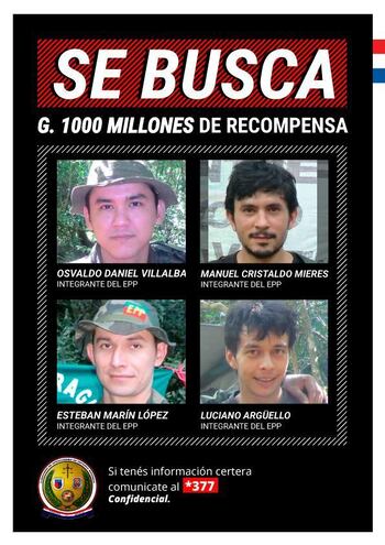 Toda información certera o de valor sobre el paradero de Osvaldo Daniel Villalba, Manuel Cristaldo Mieres. Esteban Marín López y Luciano Argullo, miembros del EPP, será recompensada con G. 1.000 millones por cada uno.