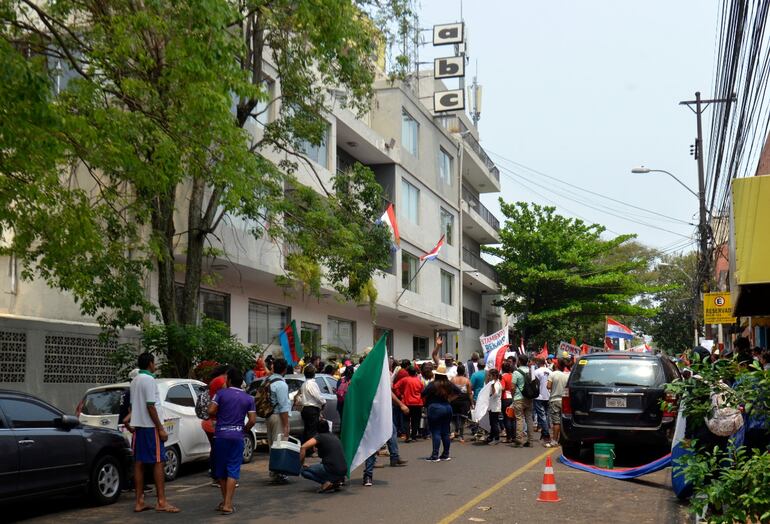 Aún así, las personas que portaban pasacalles con nombres de asentamientos de distintos puntos del país, de firmas constructoras o empresas que prestan el SAT, marcharon desde el Congreso hasta frente al Diario y se quedaron durante más de media hora, con batucada y megáfonos, con cánticos y gritos contra publicaciones de ABC, “ABC ijapu” y arengas a la gente sobre la construcción de viviendas sociales.