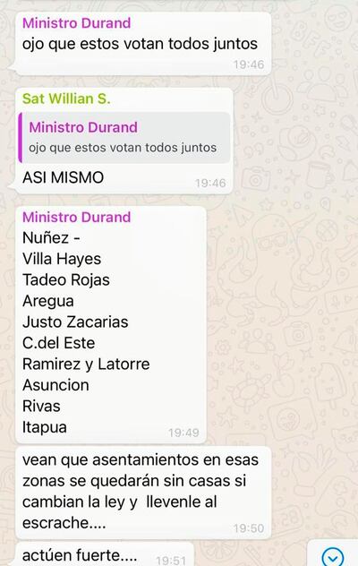 El diputado Basilio Núñez aprovechó la sesión para informar al presidente de la República, Mario Abdo Benítez, que el ministro Dany Durand insta a las organizaciones sociales a escrachar a los proyectistas, mostrando una captura de pantalla de un chat del mismo con los representantes de SAT. “Estamos pidiendo transparencia en los procesos, en ningún momento los oleros y ceramistas se quedarán sin trabajo”, manifestó.