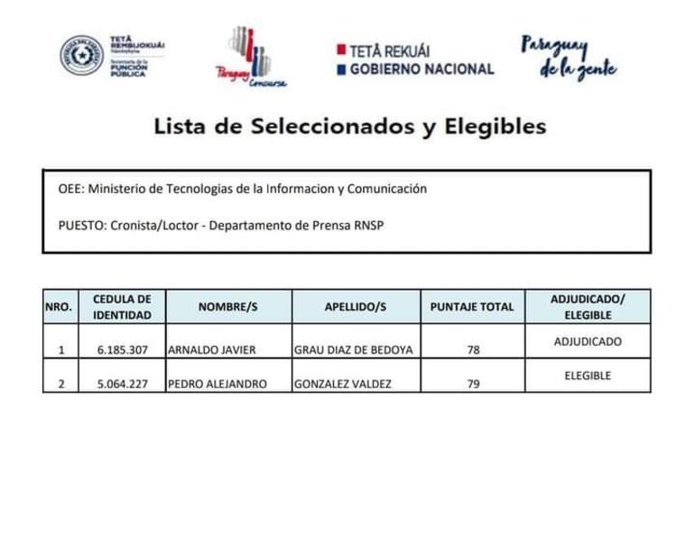 El llamado a concurso de méritos por parte del Ministerio de Tecnologías de la Información y Comunicación (Mitic) se lanzó con la portada: “Bienvenidos a Paraguay Concursa; si el mérito es tuyo, el empleo también”, pero el cargo para cronista o locutor para la Radio Nacional San Pedro FM, con estudio y planta de transmisión en San Pedro de Ycuamandyyú, no fue otorgado a los mejores puntuados ni a los profesionales, según denunciaron.