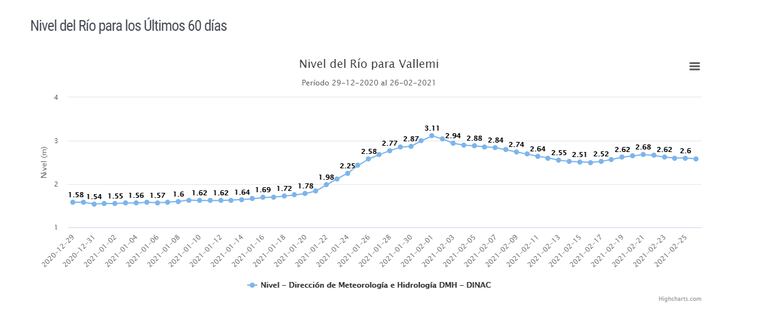 El nivel del río por localidades es como sigue: Ladario, 1,48 m; Bahía Negra, 2,46 m; Fuerte Olimpo, 3,04 m; Isla Margarita, 2,80 m; Vallemí, 2,58 m; Concepción, 2,32 m; Rosario, 2,38 m, Asunción, 3,04 m; Villeta, 3,41 m; Alberdi, 5,76 m; Pilar, 5,10 m, y Humaitá, 4,06 m.