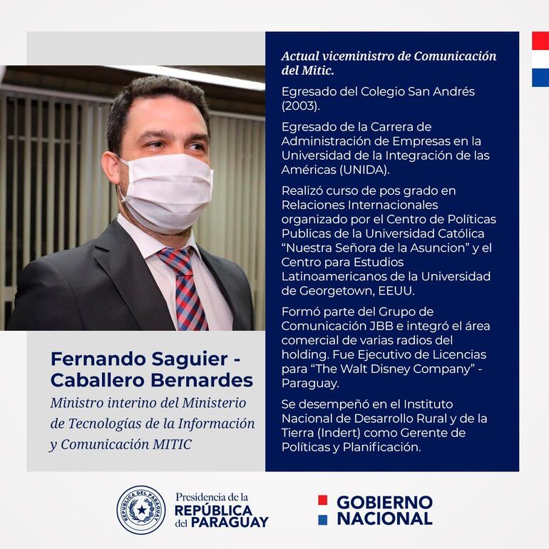 Mediante el decreto N.º 4973, el presidente Mario Abdo designó al hasta ayer viceministro de Comunicación del Ministerio de Tecnologías de la Información y Comunicación (MITIC), como Ministro Interino de la mencionada institución.