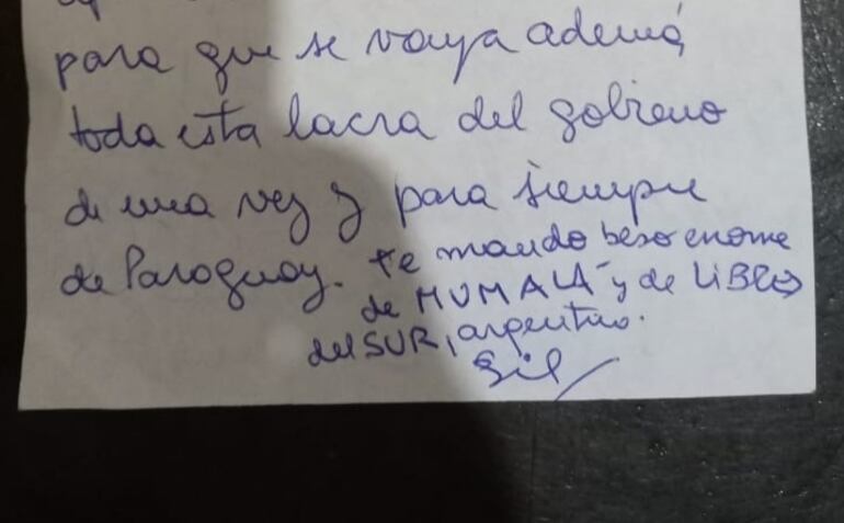 En el texto de las cartas, los remitentes se dirigen a los miembros del EPP como “camaradas” y les brindan su apoyo sobre un supuesto plan de desestabilizar al Gobierno para cumplir con el objetivo de su lucha ideológica. En una de las hojas se puede observar que firman el mensaje supuestamente el grupo feminista argentino “MuMalá” y otra agrupación política socialista del país vecino denominada “Los Libres del Sur”.