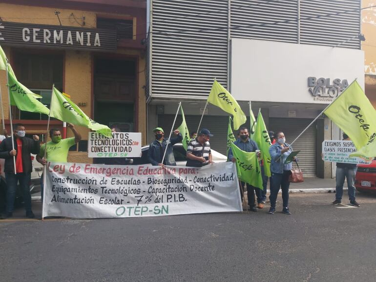 Docentes de la Organización de Trabajadores de la Educación-Sindicato Nacional (OTEP-SN) también exigen un pronunciamiento por parte del MEC sobre el proyecto de ley de emergencia educativa que plantea el gremio. “Más que nunca necesitamos recursos para la educación. No hay más plata en las gobernaciones; entonces, necesitamos una ley con las finanzas correspondientes para dar salida”, refirió un docente movilizado.