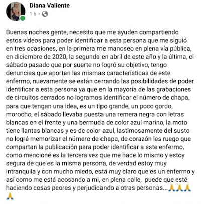 Cuatro meses después, en abril de 2021, Diana estaba caminando a la casa de su madre, que queda apenas a dos cuadras en la misma zona del supermercado, cuando una vez más el acosador volvió a aparecer y a molestarla con las mismas expresiones de la primera vez. Esta vez impidió que la tocara, pero Diana está segura de que es la misma persona, por las características físicas -robusto y morocho- y las de la moto, que tiene llantas pintadas de blanco, refirió.