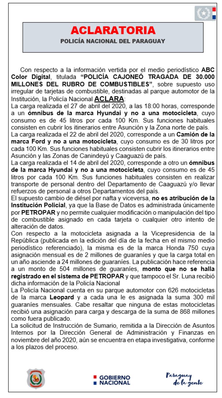 Resaltan, en ese sentido, que la Policía tiene 626 motos Leopard y cada una recibe la suma de G. 300.000 al mes. “Ninguna de esas motocicletas recibió una asignación para carga y descarga de G. 868 millones como fue publicado”, consideraron.