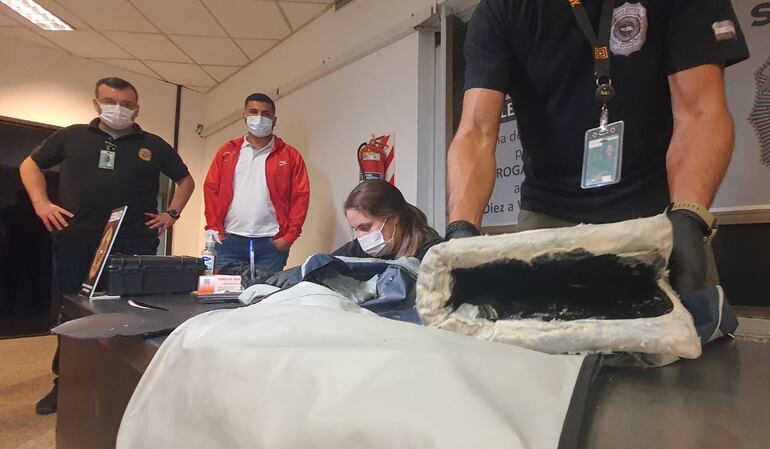 Ante esa situación, se informó desde la institución antidrogas que los agentes especiales informaron del hecho al fiscal Eduardo Royg, quien se hizo presente en el lugar. Posteriormente se procedió a la apertura de la maleta, en cuyo interior hallaron un paquete, oculto bajo doble fondo con 5 kilos 734 gramos de cocaína negra, una modalidad empleada para despistar a los controles con escáneres, mediante la mezcla con colorantes.