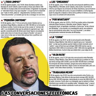El contenido de esas conversaciones -se resumen en la infografía que acompaña este material- sirvió de base a la Fiscalía para incluir a los asistentes fiscales Alarcón y Aguilar, así como los agentes policiales involucrados en el caso, en el proceso abierto a Cabaña y a Quintana.