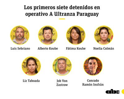 Entre los detenidos están el militar retirado Job Von Zastrow Masi, Luis Fernando Sebriani González, Alberto Koube Ayala y Fátima Koube Ayala (ambos hermanos del político colordo Daniel Koube), Liz Fabiola Taboada Gamarra, María Noelia Colmán Alarcón, pareja de Koube y Conrado Ramón Insfrán .