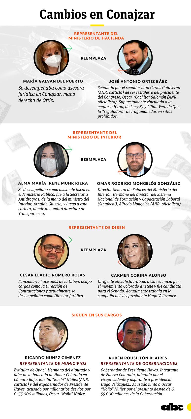 A mediados de febrero, el presidente de la República Mario Abdo Benítez firmó los decretos de relevo de tres de los cinco integrantes de la Comisión Nacional de Juegos de Azar (Conajzar): José Antonio Ortiz Báez, presidente y representante del Ministerio de Hacienda, fue reemplazado por María Galván, quien se desempeñaba como su asesora jurídica en la comisión; Carmen Alonso, representante y titular de la Dirección de Beneficencia y Ayuda Social (Diben), por Eladio César Romero Roa, su asesor jurídico en la citada institución, y Omar Mongelós González, representante del Ministerio del Interior, por Alma Muhr Riera, que se desempeña como directora de Transparencia de esta cartera.
