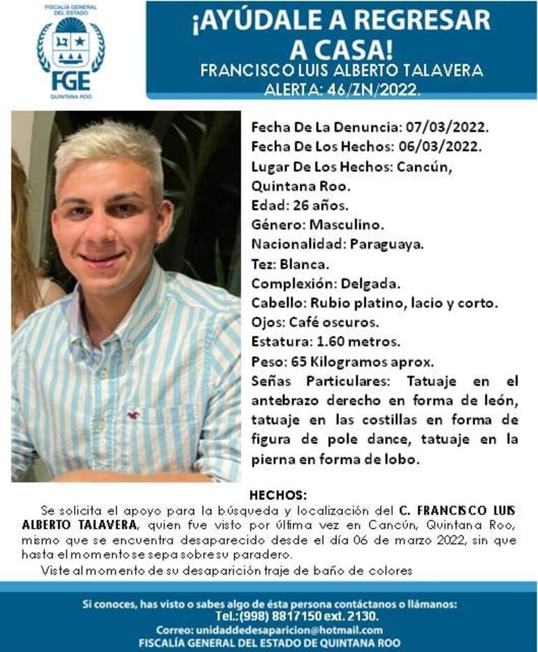 El compatriota Francisco Talavera había sido reportado como desaparecido en el balneario de Cancún, Municipio de Benito Juárez, jurisdicción del Estado de Quintana Roo, desde el atardecer del domingo 6 de marzo del corriente año.
