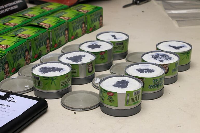 Ayala apuntó, “el primero se trata de 12 potes de un supuesto gel de aloé vera, que iban a ser remitidos a Sídney, en cuyo interior se encontraron porciones de cocaína, oculta en el doble fondo, en la base de los potes”.