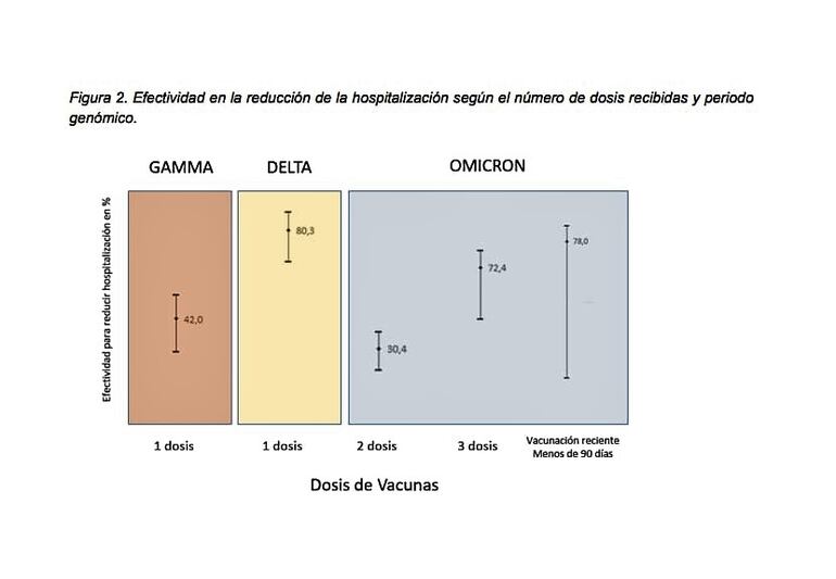 Se ha estimado la efectividad de las vacunas frente a hospitalización por COVID-19 de forma agregada para todas las vacunas. Se muestran estimaciones de efectividad ajustada para los períodos de circulación de las variantes Gamma, Delta y Ómicron, respectivamente.