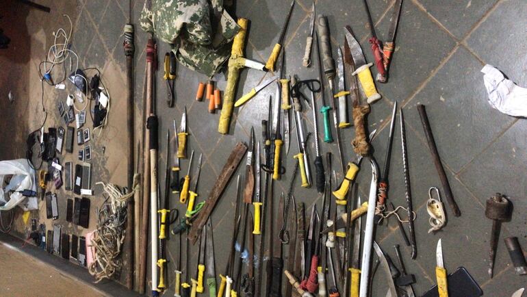 El Ministerio de Justicia informó hoy de la incautación de teléfonos celulares, numerosas armas blancas, una escopeta de fabricación casera y un uniforme militar durante la requisa.