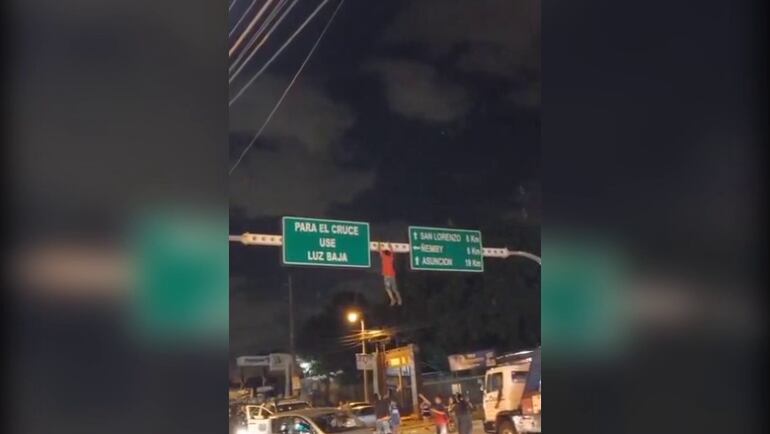 En un video que circula en las redes sociales se observa a un hombre que trepó a un cartel en plena ruta, luego se colgó para posteriormente arrojarse al asfalto. Personas que se encontraban en el lugar lograron atrapar al hombre antes que caiga al suelo. La Policía Nacional intervino en el incidente.
