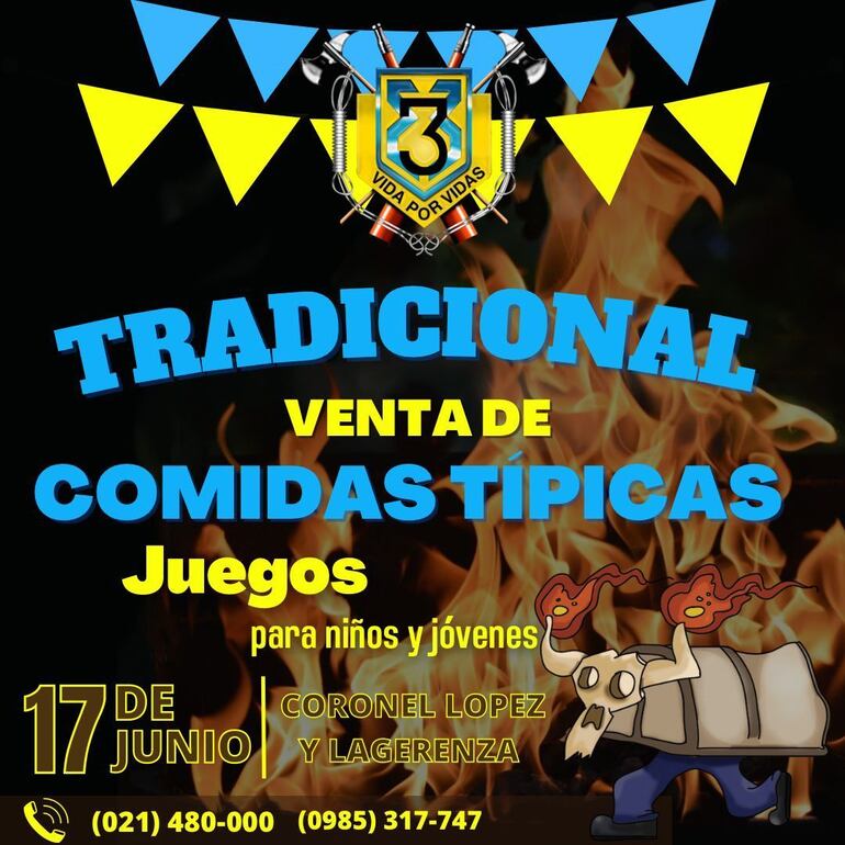 Voluntarios de la Tercera Compañía de Bomberos de Sajonia invitan a toda la ciudadanía a participar de la “Tradicional Venta de Comidas Típicas” a realizarse el sábado 17 de junio, a partir de las 16:00 en el cuartel de la compañía ubicado en la esquina de las calles Coronel López y Lagerenza, detrás mismo del Parque Carlos Antonio López de Asunción.