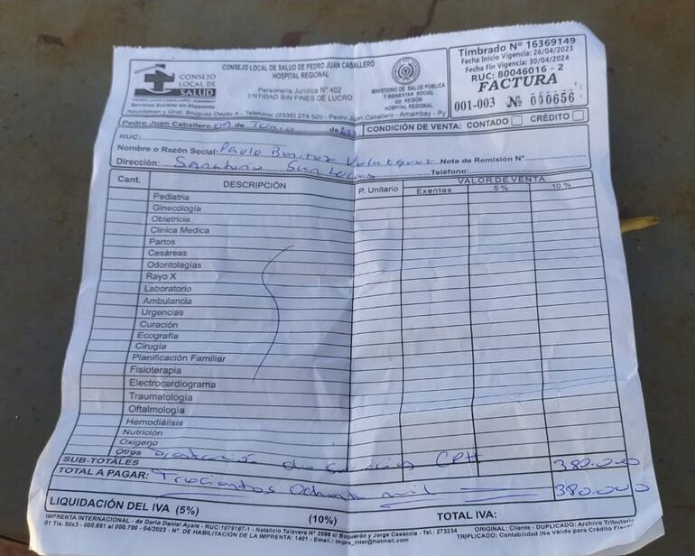 Explicó que le entregaron una factura con membrete del Consejo Local de Salud en que figura en el ítem Otros el monto cobrado.