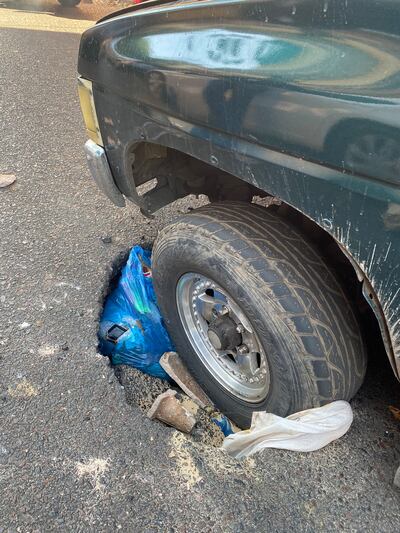 La usuaria del twitter, @lu1688, publicó en su cuenta fotos y un video de como un bache prácticamente se tragó la rueda de su camioneta.