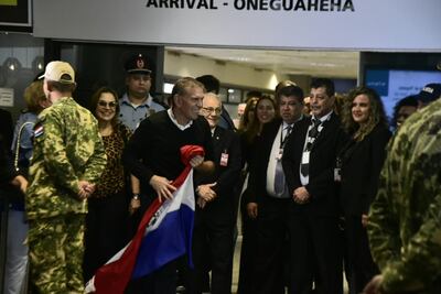 Con una bandera paraguaya en las manos y mucha emoción, Juan Ángel Napout llegó a la zona de arribo del Silvio Pettirossi, tras estar por varios minutos en la zona VIP de la terminal aeroportuaria.