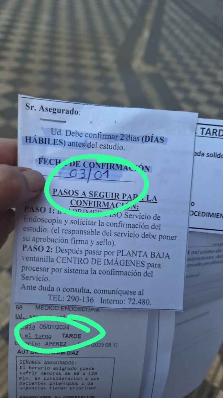 Desde ese momento, si bien ya pasó por varias circunstancias con la previsional, nunca le había tocado vivir algo como esto: su médico le dio una orden de endoscopía, y al gestionarla, le dieron turno para el 5 de enero del año 2024. El turno de Gladys Villalba es para el año que viene.