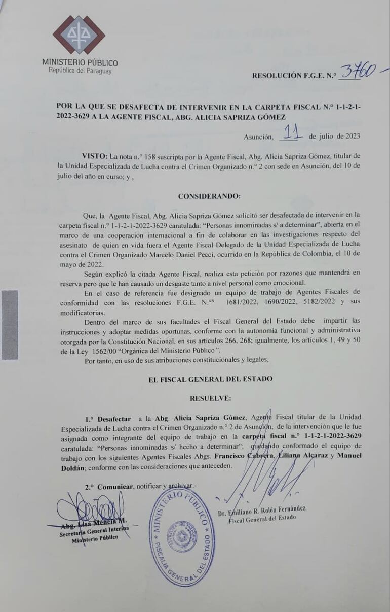 Según la nota que se dio a conocer, el fiscal general del Estado, Emiliano Rolón, firmó ayer la resolución mediante la cual se desafecta a Sapriza de la carpeta fiscal de la causa de Pecci. El equipo de trabajo quedó conformado con los fiscales Liliana Alcaraz, Manuel Doldán y Francisco Cabrera.