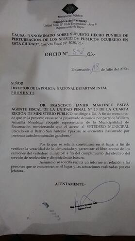“Hemos remitido un oficio a la jefatura de policía para verificar el lugar. Levantar datos de las personas que se encuentran en el sitio y garantizar el ingreso de los camiones al lugar”, sostuvo el representante del Ministerio Público requerido sobre su intervención.