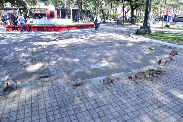 Hoy, funcionarios “arreglaron” los pisos rotos de la plaza Juan E. O’Leary, ubicada sobre Independencia y Palma. Sin embargo, la comuna ni siquiera se dignó a colocar baldosas y eligió hacer únicamente un “lecherado” para cubrir los agujeros, dejando un aspecto vergonzoso en una de las cuatro plazas principales del microcentro, donde más concurrencia habrá durante las festividades.