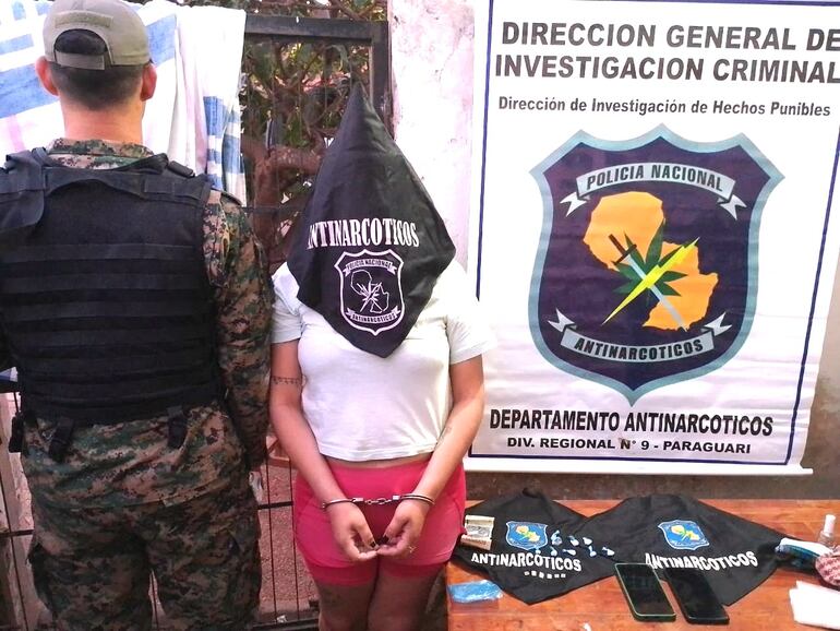 La detenida fue identificada como María Luisa Caballero, domiciliada sobre la calle Gral. Bruguez del barrio Central de este distrito. Durante el allanamiento se incautaron 8 dosis de supuesto clorhidrato de cocaína equivalentes a 43 gramos de cocaína, un aparato celular, y G. 50.000 en dinero en efectivo.