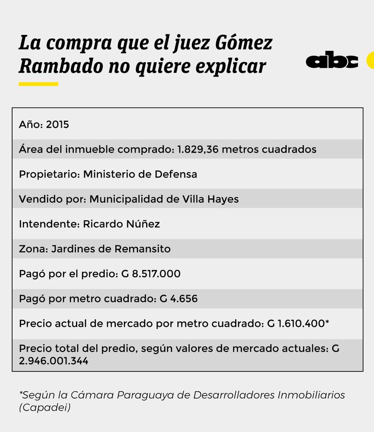 El camarista investigado por el JEM compró un inmueble en la zona de Remansito, específicamente en Jardines de Remansito, en el año 2015. Adquirió más de 1.800 metros cuadrados por las que pagó un monto de poco mas de G. 8 millones. En promedio, pagó G. 5.000 por metro cuadrado.